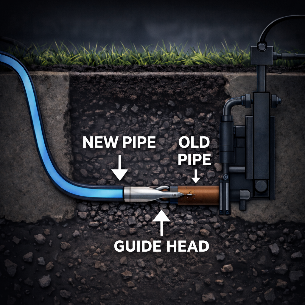A bursting head is inserted into the damaged sewer line and guided through the pipe path. As it moves forward, it breaks apart the existing pipe while towing a new, high-strength pipe behind it. The new line follows the original alignment, reducing the need for excavation.
